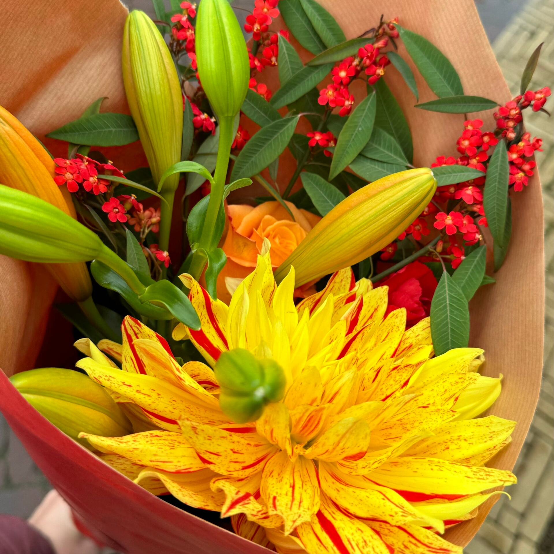 Een mooi plukboeket samengesteld in herfstkleuren.